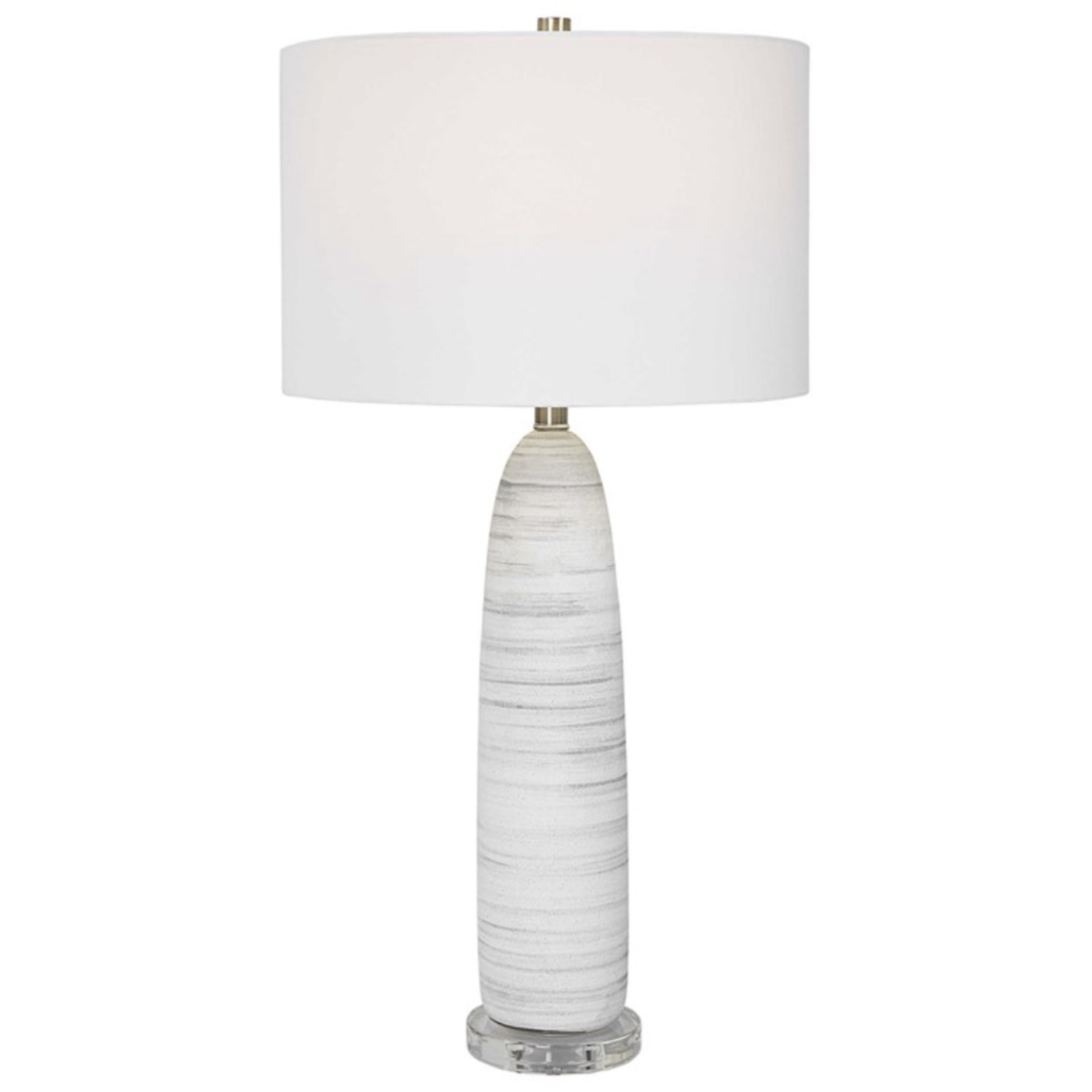 This sleek ceramic table lamp features a matte white glaze with brushed light gray detailing, paired with brushed nickel plated accents and a crystal foot. A white fabric drum shade compliments the piece.