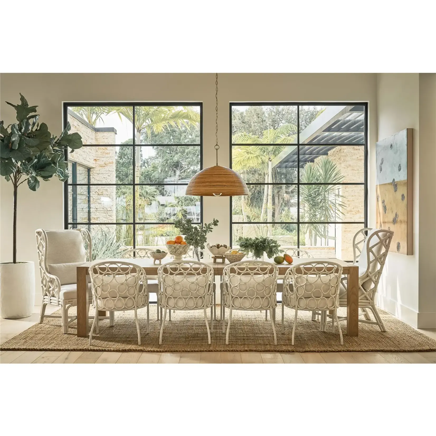 Rattan is woven into a series of circles, creating a soothing pattern in the Pebble Dining Chair. The chair also features an upholstered seat and kidney pillow for added comfort and style